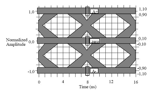 本次測(cè)試將主要驗(yàn)證產(chǎn)品上4個(gè)以太網(wǎng)100Base-TX接口的技術(shù)指標(biāo)。對(duì)于其中比較直觀的100Base-TX物理層的眼圖模板,《ANSI+X3_263-1995》標(biāo)準(zhǔn)中有著明確的眼圖模板定義見圖2。