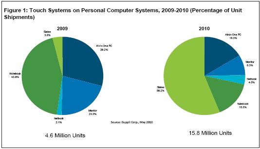 最近幾年,個(gè)人電腦市場(chǎng)對(duì)于觸摸屏的需求不斷增長,2008和2009年增長率超過20%,快于總體系統(tǒng)市場(chǎng)。但與該市場(chǎng)2010年462%的增長率相比,上述增長速度就相形見絀了。平板觸摸電腦是PC觸摸革命中的主要初期推動(dòng)者,預(yù)計(jì)占PC觸摸市場(chǎng)的比例將從2009年的3.8%銳升到56.2%,而總體PC觸摸市場(chǎng)規(guī)模將擴(kuò)大兩倍。