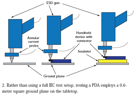 對(duì)于小型產(chǎn)品來(lái)說(shuō),工程師經(jīng)常在專(zhuān)門(mén)的測(cè)試環(huán)境中執(zhí)行系統(tǒng)級(jí)ESD測(cè)試(圖1)。對(duì)IEC61000-4-2測(cè)試而言,這些測(cè)試環(huán)境包括:地板上的金屬接地板、木桌、放在桌子上的金屬水平耦合板(到接地板有個(gè)0.95米長(zhǎng)的連線,在水平耦合板之上的一個(gè)0.5mm絕緣層)。