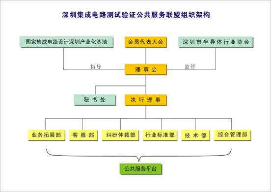 如上圖所示,會員代表大會由IC設(shè)計公司,封裝測試廠,設(shè)備廠商,高校,研究所和電子制造工廠代表組成,是深圳集成電路測試驗證公共服務(wù)聯(lián)盟的最高權(quán)力機構(gòu),下設(shè)理事會,理事會是聯(lián)盟管理的智囊團,各種規(guī)章制度的起草者和重大事務(wù)的決策者,其下又設(shè)執(zhí)行理事和秘書處,執(zhí)行理事負責日常事務(wù)的實際運行,是公共服務(wù)聯(lián)盟的操作單位,秘書處主要負責會員代表大會的召開以及日常會員事宜的組織,執(zhí)行理事又下設(shè)業(yè)務(wù)拓展部、客服部、糾紛仲裁部、行業(yè)標準部、技術(shù)部和綜合管理部。
