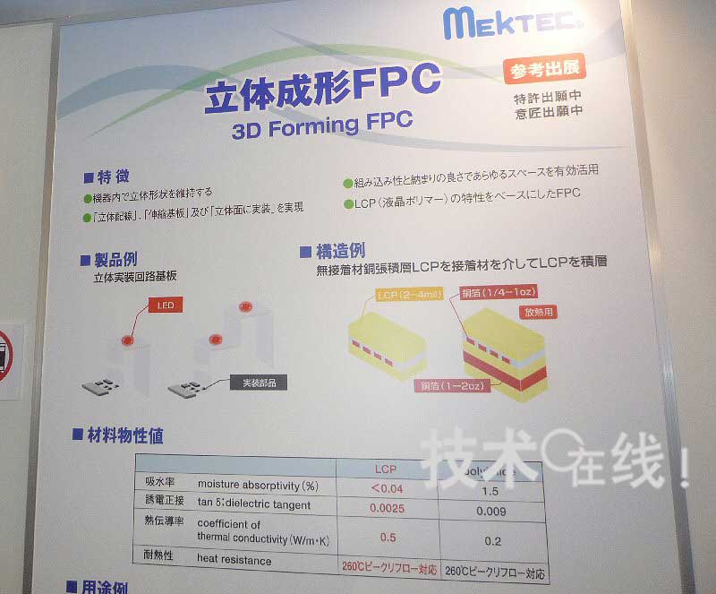 立體成型FPC上使用的液晶聚合物,與普通柔性底板中使用的聚酰亞胺相同,也可以經(jīng)得住260℃的回焊(Reflow)。導(dǎo)熱率方面,聚酰亞胺為0.2W/m·K,液晶聚合物為0.5W/m·K。聚酰亞胺的吸水率為1.5%,液晶聚合物不到0.04%,介電損耗因數(shù)前者的為0.009,后者為0.0025。