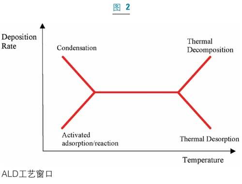 [page]由于ALD是基于在交互反應過程中的自約束性生長,此工藝必須經過精細的調節來達到最合適的結果。即使原子層淀積唯一的表面反應特征降低了正常化學氣相淀積對溫度、壓力和組分的嚴格要求,人們仍然需要優化ALD的參數以實現其準確的厚度控制和超級的保型性。反應室溫度是用來控制表面飽和的重要參數之一,作為ALD的基礎,反應室溫度起著兩個主要作用:提供原子層淀積反應所需的激活能量和幫助清除單原子層形成過程中的多余反應物和副產品。單原子層形成最理想的ALD溫度窗口,如圖2所示。ALD工藝窗口與反應物的選擇、用量以及清除息息相關。為了獲得完全的單層覆蓋,足量的具有熱穩定性的反應物,即在反應溫度下不會分解的反應物,被引入到襯底上。人們往往使用過量的反應物來確保實現完全覆蓋。通常采用以下幾種參數來控制反應物的劑量:反應物源的溫度、流量、分壓以及這個反應室的壓力。