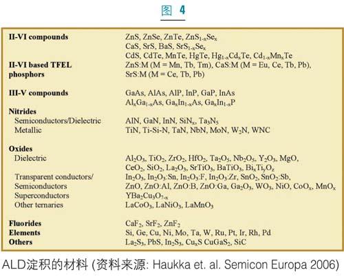 因為ALD在半導體制造的不同領域都經過評估和采用,所以選擇合適的原始反應物(precursor)就變得日益重要。ALD原始反應物應當具備幾個“理想”的品質,即要具有一定的揮發性和可重復的汽化率;理想情況下不應在反應溫度下發生自身反應或分解;應當極易與補充反應物發生反應;應能產生可揮發的副產品;基于生長速率和成核的原因應具有最佳的配合基尺寸。為了使用方便,原始反應物最好為液體有機金屬物,但是薄膜的性質和應用指標(如雜質含量、電學特性等)應該決定材料的選擇。另外,對制備成本的關注也要求反應源能與傳統的制備工藝在成本上更有競爭性。ALD具有很高的反應源的使用效率,這通常能平衡新反應源的高價格。隨著ALD進入大規模生產,并且工業界減少對反應源的選擇,對成本的顧慮將可能會隨著化學品供應商規模化其生長流程而減輕。利用現有的反應源,目前人們已經可以制備多種多樣的ALD薄膜(圖4)。