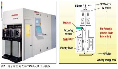 首先,它擺脫了照明光源,檢測結果不會受到類似變色、厚度不均等各種層面所帶來的物理因素的影響;其次,電子束的分辨率極高。因為它的檢測單位是電子,電子要比微波以及任何尺寸的顆粒或缺陷都要小得多;再次,電子是帶有電性的電荷,所以它可以被用于分析材料的電性或電組織成分,這被稱作電壓對比度圖像,經常被用于檢測類似開閉鎖等電子電路缺陷和通孔蝕刻不足等材料缺陷。電子束檢測設備一般有KLA-Tencor和HMI公司的Escan系列(如圖5所示)。