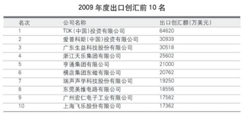 對于中國電子元件行業的外貿出口來說,2009年是一個從谷底緩慢爬升的過程。本屆元件百強中出口創匯總額為52.48億美元,同比下降10.38%,占銷售收入總額的28.81%,與上屆元件百強的出口總額相比,下降了9.83%。由于國際金融危機導致了外需萎縮,而且我國刺激內需的各項政策效果明顯,一些元件百強企業開始更多地關注國內市場,所以本屆元件百強的出口創匯額雖然下滑,但整體銷售收入仍然獲得增長。