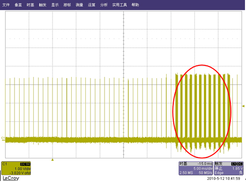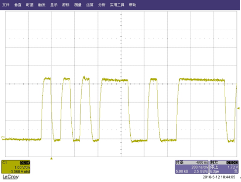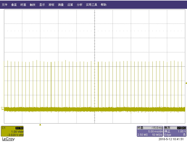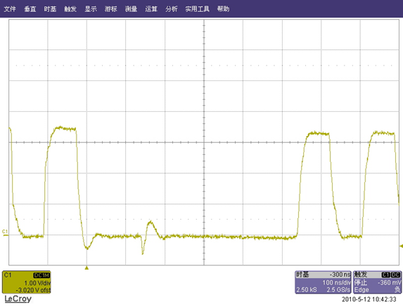 而且這個“飛鳥”和林中的“鳥”相比較很多特點差不多,用什么邊沿、脈寬、邏輯等觸發(fā)還拿它沒辦法;正一籌莫展之際,仔細觀察圖二,終于找到這個“飛鳥”的弱點,正常的波形沒過沖,而數(shù)據(jù)量突發(fā)增大的波形有,不過它跟我們經(jīng)常見到的出現(xiàn)在波形上方的過沖有點差別(而我們往往習慣于在0軸上方找觸發(fā)點、設置觸發(fā)電平),它出現(xiàn)在0軸的下面,正因為這點差點讓它“飛”走了,弱點找到就好辦了,我們把觸發(fā)電平設置在0軸下面的過沖上,并按下normal或single的觸發(fā)模式,“鳥兒”很容易就抓到了: