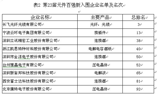 本屆元件百?gòu)?qiáng)中共有9家新企業(yè),其中,我國(guó)光纖光纜制造業(yè)的龍頭企業(yè)長(zhǎng)飛光纖光纜有限公司表現(xiàn)最為突出,一舉斬獲本屆元件百?gòu)?qiáng)的季軍寶座。而寧波云環(huán)電子集團(tuán)有限公司、深圳立訊精密工業(yè)股份有限公司、浙江凱恩特種材料股份有限公司、深圳市金洋電子股份有限公司等新入圍企業(yè)均表現(xiàn)不俗。