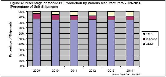 看到移動PC產業具有誘人的增長潛力,重量級EMS提供商,如鴻海(又名富士康科技集團)和偉創力,開始在2007和2008年介入移動PC ODM業務。這兩家EMS提供商一直在積極擴大研發隊伍,2009年開始從惠普和戴爾等一線OEM廠商獲得重要項目。
