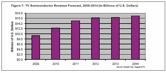 2009年電視半導體銷售額高達93億美元,由于液晶電視需要更多的半導體芯片支持各種高級功能,2010年銷售額有望更上層樓。iSuppli公司的預測顯示,2010年電視半導體市場將達到121億美元。