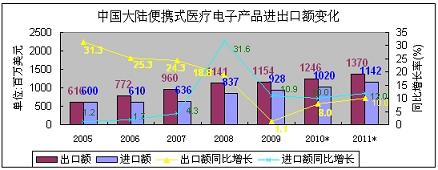 1.便攜式醫療電子產品出口額略大于進口,但進口額增長較快
