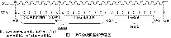 如圖1所示是常見的I2C總線上傳輸?shù)囊蛔止?jié)數(shù)據(jù)的數(shù)據(jù)幀,其總線形式是由數(shù)據(jù)線SDA和時鐘SCL構(gòu)成的雙線制串行總線,并接在總線上的電路模塊即可作為發(fā)送器(主機(jī))又可作為接收器(從機(jī))。幀數(shù)據(jù)中除了控制碼(包括從機(jī)標(biāo)識碼和訪問地址碼)與數(shù)據(jù)碼外還包括起始信號、結(jié)束信號和應(yīng)答信號[4]。