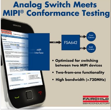 飛兆半導體公司(FaIRchild SemicONductor)開發了一款低功率、雙數據對2:1、高速MIPI開關產品FSA642。該器件是飛兆半導體MIPI兼容開關系列的新產品,是目前唯一通過MIPI UNH-IOL的700Mbps數據率互用性測試的MIPI開關。