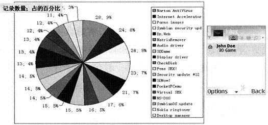 當用戶打開含有CommWarrior病毒的MMS消息后,該病毒將在手機中進行安裝,并開始向手機號碼薄中的用戶隨機發送含有自身拷貝的MMS消息。同時,CommWarrior會偽造彩信主題進行傳播,通常包含著這樣的內容“來自我的3D游戲!免費!”以及“適合所有型號諾基亞手機的鈴聲”等,使得接受彩信的用戶不會引起警覺,具體各類的消息內容的比例如圖2所示。