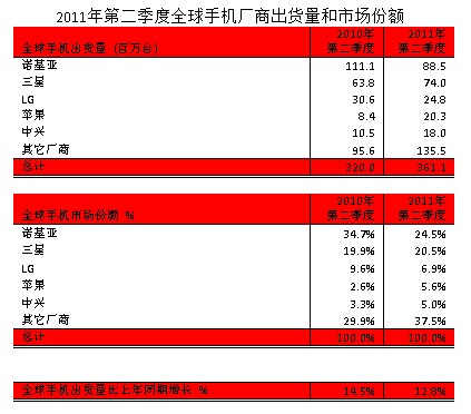 日前,據Strategy Analytics最新研究顯示,2011年二季度全球手機出貨量比去年同期增長13%,達到3.611億臺。諾基亞出現自1999年以來最大下滑,而蘋果已經接近排名第三的LG。