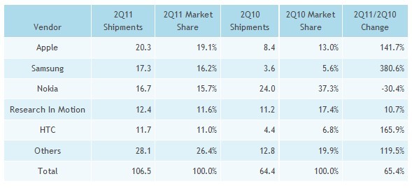 IDC最新市場(chǎng)報(bào)告指出,2011年第二季智能手機(jī)市場(chǎng)表現(xiàn)亮眼,出貨量從去年同期的6440萬支成長(zhǎng)至1.065億支,成長(zhǎng)了65.4%。而蘋果市占率達(dá)19.1,居市場(chǎng)首位,其后分別是三星、諾基亞、RIM與HTC宏達(dá)電。