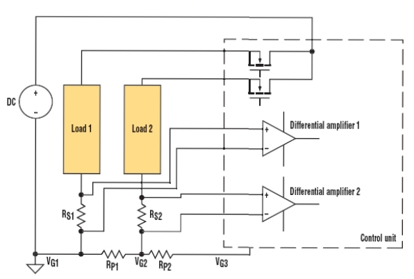 由于低端測量例子可能產生共模問題,這里考慮圖4所示的分布負載系統。虛線框中的控制單元使用MOSFET來控制輸送到兩個負載的功率。電源、負載和控制單元之間的寄生電阻RP1和RP2代表接地引線電阻和連接器電阻之和。在實際電路中,它們的數值可能為幾百毫歐。對于這個例子,假設RP1和RP2為0.2 Ω。差分放大器1和2與圖3中的差分放大器類似。