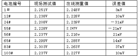 根據(jù)規(guī)程的要求,日常測(cè)量蓄電池端電壓采用是高精度4位半的數(shù)字萬用表,一般高精度萬用表蓄電池直流電壓檔測(cè)量精度為0.7%以上,絕大多數(shù)蓄電池在線裝置產(chǎn)品說明書上提到的測(cè)量精度達(dá)到了0.5%以上;顯示測(cè)量數(shù)值有些蓄電池在線裝置的測(cè)量端電壓數(shù)值為小數(shù)點(diǎn)后2位,與規(guī)程要求有較大誤差;有些裝置測(cè)量值雖可以到小數(shù)點(diǎn)后3位,但與實(shí)際用表測(cè)量數(shù)值相差較大。從運(yùn)行情況看,端電壓在線監(jiān)測(cè)的誤差是隨機(jī),每個(gè)數(shù)值偏差都不一致,而且偏差值隨著環(huán)境溫度、浮充電壓變化等而變化。表1為現(xiàn)場(chǎng)任意抽查幾個(gè)蓄電池浮充電壓,現(xiàn)場(chǎng)測(cè)試值與在線測(cè)量值的誤差情況,現(xiàn)場(chǎng)測(cè)試采用FLUK111數(shù)值萬用表直流檔測(cè)量精度0.7%,在線測(cè)量為許繼電源公司的WXJ-16型巡檢儀,測(cè)試環(huán)境溫度25℃。
