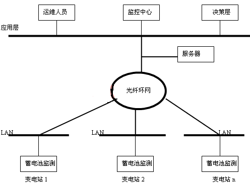 蓄電池在線監(jiān)測(cè)還可以利用通訊手段進(jìn)行網(wǎng)絡(luò)化管理(如圖4),將幾個(gè)站或一地區(qū)的蓄電池監(jiān)測(cè)通過光纖進(jìn)行組網(wǎng),建立一個(gè)實(shí)時(shí)遠(yuǎn)程智能化蓄電池監(jiān)測(cè)網(wǎng)絡(luò)化管理系統(tǒng),以實(shí)現(xiàn)信息集中和遠(yuǎn)程控制,使運(yùn)行檢修人員、相關(guān)人員和管理決策層能夠通過局域網(wǎng)內(nèi)的任何一個(gè)終端用IE瀏覽的方式即可實(shí)時(shí)掌握各變電站蓄電池的運(yùn)行情況及其性能變化趨勢(shì),使蓄電池得到及時(shí)的維護(hù),同時(shí)也為“設(shè)備狀態(tài)檢修”提供可靠依據(jù),將“定期維護(hù)檢修”轉(zhuǎn)變?yōu)?ldquo;狀態(tài)檢修”,從而實(shí)現(xiàn)對(duì)蓄電池的科學(xué)化管理,保證系統(tǒng)的可靠、安全運(yùn)行。