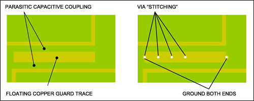 填充地也稱為保護線,通常將其用于電路中很難鋪設連續接地區域或需要屏蔽敏感電路的設計(圖10)。通過在引線兩端,或者是沿線放置接地過孔(即過孔陣列),增大屏蔽效應。請不要將保護線與設計用來提供返回電流通路的引線相混合,這樣的布局會引入串擾。