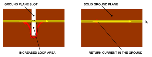 返回電流通路須盡可能靠近主電流通道,將輻射磁場降至最小。這種布局有助于減小電流環路面積。返回電流的理想低阻通路通常是引線下方的接地區域—將環路面積有效限制在電介質厚度乘以引線長度的區域。但是,如果接地區域被分割開,則會增大環路面積(圖3)。對于穿過分割區域的引線,返回電流將被強制通過高阻通路,大大提高了電流環路面積。這種布局還使電路引線更容易受互感的影響。