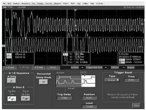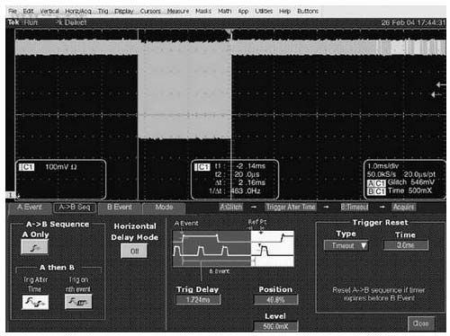 在這一過程中,A事件啟動延遲計數器,計算脈沖數量。一旦產生了32個脈沖,它會使B觸發器監測第33個脈沖。當檢測到特定脈寬時,B系統便設成觸發采集,這時,示波器觸發并記錄數據。如果沒有第33個脈沖,復位條件會重新準備A觸發器,再次啟動整個流程。