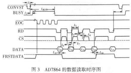 (1)低頻部分。本部分主要采集的是電源信號和電平變換信號,采用AD7864 作為采集芯片。AD7864 具有片內時鐘、讀寫允許邏輯、多種通道選擇方式以及內部精確的2。5 V 參考電壓,這使得其與高速處理器的接口變得非常簡單。AD7864 轉換后的數據讀取采用轉換后讀取數據的方式,其讀取時序見圖3。