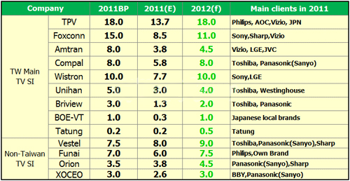 受到品牌需求減少影響,加上部分品牌增加自制比率,臺(tái)灣代工廠第三季呈現(xiàn)5.2%之衰退,但經(jīng)過庫存去化及品牌預(yù)拉升年底銷售業(yè)績影響,預(yù)估第四季將有6-9%之成長力道。但整年度看來,TPV(冠捷)還是坐穩(wěn)第一名,明年如能順利掌控PHILIPS品牌,2012年度計(jì)劃有可能朝20百萬臺(tái)邁進(jìn);鴻海(Foxconn)和緯創(chuàng)(Wistron)則受到Sony大幅調(diào)降電視需求影響,今年目標(biāo)恐難以達(dá)成,明年成長力道也將受到限制;仁寶(Compal)、永碩(Unihan)、景智(Briview)主要客戶群皆以日本品牌Toshiba(主要為歐日訂單)為主,日震和歐洲經(jīng)濟(jì)困頓,也大大影響其年度績效;瑞軒(Amtran)則受到Vizio波及,整體代工量也未能達(dá)標(biāo)。盡管臺(tái)灣電視代工廠有Philips、Sony、Toshiba及Vizio等國際品牌及自有品牌的加持,但還是逃不過大環(huán)境不佳的沖擊。
