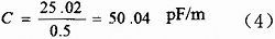 設樣品浸入水中的長度為500mm,電容測試儀顯示值為25.02pF,就可以測得單位長度電容為:
