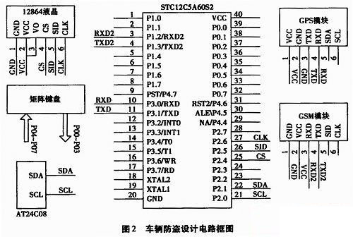 人機(jī)接口包括矩陣鍵盤(pán)和液晶顯示部分,主要用于實(shí)現(xiàn)預(yù)置的手機(jī)號(hào)碼的輸入、顯示和防盜功能的開(kāi)啟與關(guān)閉功能。存儲(chǔ)器采用HC總線的EEPROM AT24C08,其為非易失性存儲(chǔ)器,存儲(chǔ)的數(shù)據(jù)可保存100年以上,并可進(jìn)行上萬(wàn)次擦寫(xiě)。單片機(jī)將GPS上接收來(lái)的數(shù)據(jù)進(jìn)行解析后,所獲得的車(chē)輛所處的經(jīng)、緯度,速度等信息保存在該存儲(chǔ)器中,為以后做為公安機(jī)關(guān)的證據(jù)依據(jù)。
