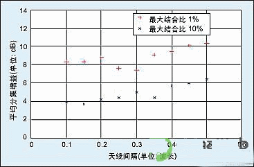 圖6:在市區(qū)、非LOS環(huán)境下,空間分集測量中平均分集增益與天線間隔關(guān)系圖