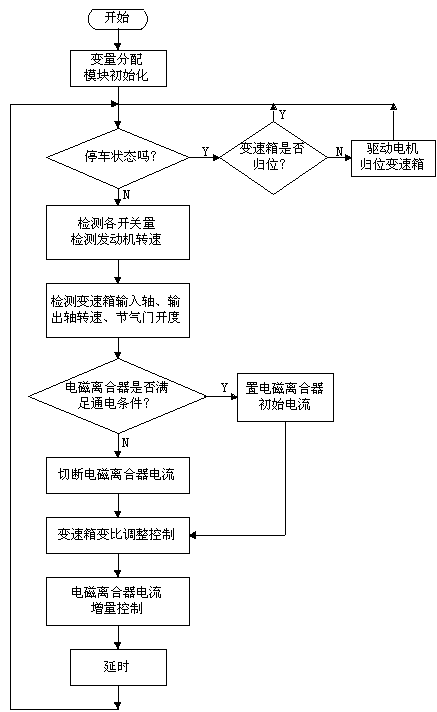 TCU控制系統(tǒng)主程序框圖如圖3所示。程序首先對內(nèi)部RAM進(jìn)行分配,然后對各功能模塊如Administrator/D轉(zhuǎn)換器、定時(shí)器、PWM波形發(fā)生器等進(jìn)行初始化。變速箱的變比在汽車每次時(shí)應(yīng)處于最小變比的位置,因此在每次停車時(shí)應(yīng)將變速箱歸位,汽車起動后首先檢測各參數(shù),如檔位開關(guān)、發(fā)動機(jī)轉(zhuǎn)速、節(jié)氣門開度、變速箱輸入、輸出軸轉(zhuǎn)速等。這些參數(shù)是控制電磁離合器電流和電動機(jī)狀態(tài)的依據(jù)。當(dāng)需要增加變速箱的變比時(shí),TCU控制電機(jī)正轉(zhuǎn),反之控制電機(jī)反轉(zhuǎn)。電磁離合器的控制采用電流增量控制方式。它的控制好壞,直接影響汽車運(yùn)行的平穩(wěn)性和經(jīng)濟(jì)性。