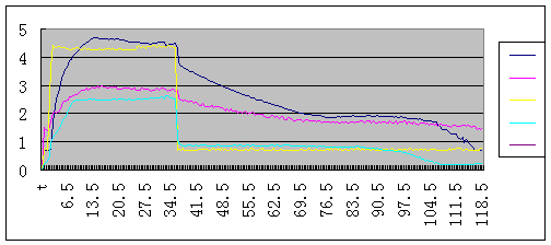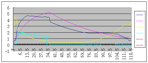圖5為汽車速度從零加到120KM/H后又由120KM/H減到零時(shí),位置傳感器與輸入軸轉(zhuǎn)速、輸出軸轉(zhuǎn)速和電機(jī)電壓之間的關(guān)系曲線。由圖可知,當(dāng)汽車速度在從零加到120KM/H過程中,位置傳感器變比由最大開始下調(diào)直到變?yōu)樽钚。藭r(shí)對應(yīng)電機(jī)反轉(zhuǎn)。當(dāng)車速由120KM/H開始下降時(shí)位置傳感器先保持不變,此時(shí)電機(jī)不轉(zhuǎn),同時(shí)輸入軸轉(zhuǎn)速和輸出轉(zhuǎn)速成比例的下降,當(dāng)車速達(dá)到一定的值時(shí)位置傳感器速比由最小開始上調(diào)直到為最大值,此時(shí)電機(jī)反轉(zhuǎn)(因測試時(shí)采用的電流傳感器為單方向的,所以圖中沒有反映出反向電流)。輸入軸轉(zhuǎn)速和輸出軸轉(zhuǎn)速不成比例的下降直至為零。從圖5可以看到車速在上升時(shí),位置傳感器速比的測試值不斷地減小(對應(yīng)的轉(zhuǎn)速比增大)。反之,車速在下降的過程中,當(dāng)車速小于某一值時(shí)測試值增加。從而實(shí)現(xiàn)了變速箱變比的自動調(diào)整。