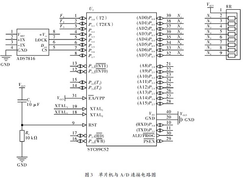 因為Pt100是模擬溫度傳感器,且溫度測量范圍廣,所以設(shè)計采用ADS7816,A/D電路圖如圖3所示。管腳VREF接橋式測溫電路的基準電壓,管腳+IN信號數(shù)據(jù)輸入口接INA126運放的輸出端,-IN、GND管腳分別接地。管腳CS片選端接單片機的P1.6口,低電平有效,當P1.6口置低電平時A/D選通,開始工作。管腳Dout信號數(shù)據(jù)輸出口接單片機的P1.5口,用于讀取A/D轉(zhuǎn)換后的數(shù)據(jù)。管腳LOCK時鐘信號口接單片機的P1.4口,單片機P1.4口提供A/D連續(xù)時鐘脈沖,保證A/D數(shù)據(jù)轉(zhuǎn)換和讀取的正常。管腳VCC接經(jīng)LM1117穩(wěn)定后的輸出電壓3.3 V。設(shè)計采用STC公司的89C52單片機作為核心,在系統(tǒng)中用89C52單片機來讀取A/D轉(zhuǎn)換數(shù)據(jù)并處理,然后控制液晶顯示,是設(shè)計中所有器件的核心模塊。