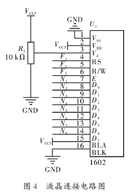 基于液晶1602顯示內(nèi)容豐富,功耗低等優(yōu)點,選用液晶1602作為顯示模塊。液晶的第1管腳是接地管腳,管腳VCC接電源,液晶的管腳VL外接電源串聯(lián)一個10 kΩ的電位器后接地,用來調(diào)節(jié)液晶的亮度對比度,使其顯示清楚、準確。管腳RS接單片機的P1.0口。管腳RW接單片機P1.1。管腳EN接單片機P1.2口,是液晶的使能管腳。液晶的數(shù)據(jù)口(7~14管腳)接單片機的P0.0~P0.7口,液晶的數(shù)據(jù)口采用8位并口方式進行數(shù)據(jù)傳送。第15,16管腳是液晶背光燈的正負極,分別接VCC和GND即可。液晶連接電路圖如圖4所示。