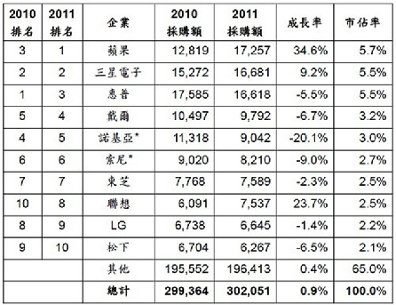 2011電子品牌廠對半導體市場貢獻顯著