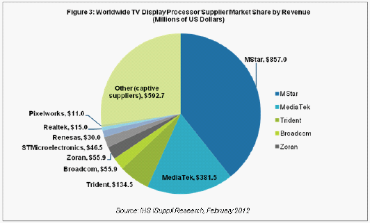 據(jù)IHS iSuppli公司的顯示電子專題報告,憑借與中國大陸廠商的緊密關(guān)系和清晰的產(chǎn)品策略,臺灣半導(dǎo)體芯片供應(yīng)商晨星與聯(lián)發(fā)科2011年幾乎完全統(tǒng)治了電視視頻處理器市場,而包括英特爾在內(nèi)的幾家廠商則認(rèn)負出局。