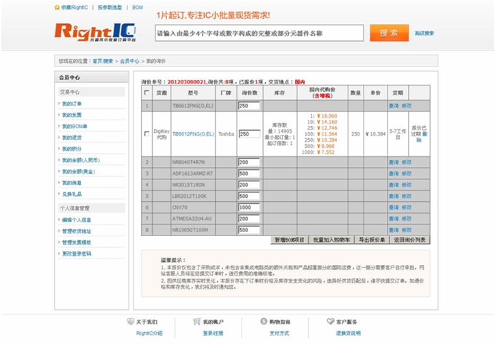 圖1:RightIC網(wǎng)站BOM單批量查詢功能的詢價頁面。