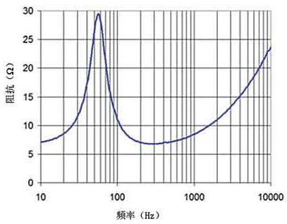 圖5 8Ω阻抗、13cm口徑揚聲器的阻抗隨頻率改變而急劇變化
