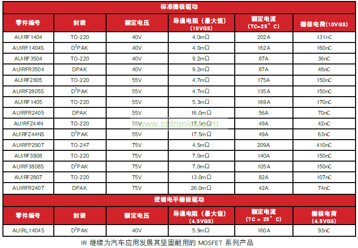 International Rectifier 的符合汽車標(biāo)準(zhǔn)的最新 MOSFET 系列具有低通態(tài)電阻和高電流處理能力,可滿足傳統(tǒng)內(nèi)燃機(jī)(ICE) 平臺(tái)以及微型和混合動(dòng)力汽車平臺(tái)方面的重負(fù)載應(yīng)用。