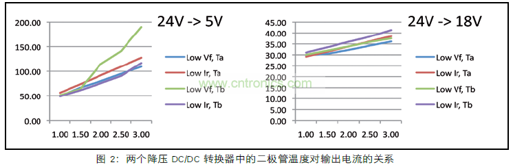 圖 2 還清楚地顯示輸入輸出電壓比。左圖顯示低占空比5 V輸出的D C / D C 轉換器。在較低的占空比時,T2的時間較長,功耗也較高。這反過來使二極管更熱,使得Ir增加地更大,因此PT1變得更高??偟慕Y果是:在輸出電流增加時,二極管的溫度會很快地升高。在電流較高時,溫度實際上已經超過了二極管規定的工作范圍。在圖 2 的右側,較高的輸出電壓18V時,它的占空比也比較高,這使得PT2損耗保持在可控制范圍內。二極管上產生的熱量較少,使得Ir增加的幅度較小,因此,PT1會更少,并且整體溫度升高幅度較小。
