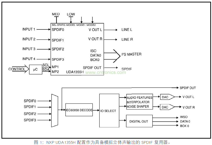 圖 1 顯示了配置為 1/4 SPDIF 的多路復用器,有模擬立體聲輸出的 NXP UDA1355H。請注意,復用器中選擇的SPDIF 信號也可以傳輸到 SPDIF 輸出,使組件可以使用菊花鏈,保持數字域音頻,維持音頻質量。因此,可以很容易地實現 1/(3n+1)多路復用器,其中第 n 個DAC,I2S 或 SPDIF 作為主復用輸出。如果這是所需要的全部,通過簡單將 SEL_STATIC引腳設置為高( 靜態模式),而不是中(I2C 模式),僅使用 UDA1355H無須微控制器就可以實現。