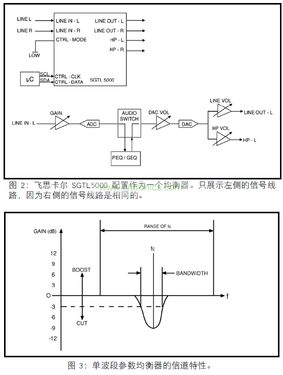 來自飛思卡爾半導體的 SGTL5000 編解碼器,提供了增強音頻功能的不同選擇。圖 2 顯示了使用設備均衡塊的應用,可以作為音調控制器,七波段參數均衡器或五波段圖形均衡器。