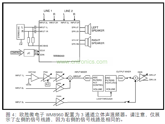 其它功能包括主音量,自動音量控制,環繞立體聲和低音增強。SGTL5000 還提供了一個集成的耳機放大器。第三個設備,來自歐勝微電子的 WM8960,是目前編解碼器中高水平集成技術的代表。此部分顯示在圖 4 中,已配置為立體聲麥克風和兩個立體聲線路級源的立體聲混頻器,帶有直接(D 類)揚聲器驅動器。它還包括一個片載耳機驅動器,連接 16Ω 負載,功率可達 40mW。