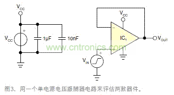 為更好地理解違反VICMR的效果,下面給出一些實例。用兩只具有不同VICMR規(guī)格的運放可演示這些效果。這些器件都有軌至軌的輸出,排除了輸出級造成的限制。一個單電源的電壓跟隨器電路用于兩只器件的評估(圖3)。所有測試均在一個實驗臺上完成,室溫約為25°C。