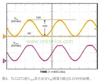 測試電路時,在其輸入端加一個直流偏移為VCC電壓一半(或5V)的300Hz正弦波。調 節(jié)交流幅度,直到看到VOUT有一個變化。當施加10V峰峰值輸入時,VOUT顯示一個接近正電源軌的削峰信號,而不是接近負電源軌。這個接近正電源軌的不良性能就是預計輸入超過9.2V時的結果。對于0~9.2V之間的VIN,VOUT顯示和預期一樣的正確波形(圖4)。