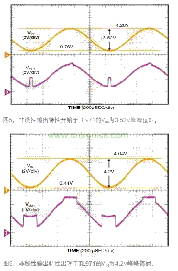 VIN中心在2.5V時,VIN增加到2.7V峰峰值,VOUT都有預期的線性特性。當VIN增加到約3.5V峰峰值時,中心在2.5V,VOUT繼續(xù)跟隨VIN,表現(xiàn)出正確的運放特性。注意這個線性特性好于數據表對VICMR的限制,但仍然超出了保證的極限值。當VIN增加到略高于3.52V峰峰值時,VOUT開始在接近正電源5V軌和負電源0V軌時表現(xiàn)出非線性特性(圖5)。VIN進一步增加到4.2V峰峰值,明顯超出了VICMR。當輸入峰值超過了近正電源軌的極限時,VOUT的信號輸出超出電源軌,跳到正電源軌5V以上,并停留在這里,直到VIN回到可接受范圍內(圖6)。當輸入跌到接近負電源軌的極限以下時,VOUT的信號表現(xiàn)出一個相位反轉,跳至中軌2.5V,并以一個偏移跟隨VIN,直到VIN增加到VICMR內的一個可接受電壓值。