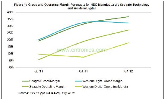 第一季度希捷的毛利率達(dá)到36.9%,高于去年第四季度時(shí)的31.6%,以及去年第三季度時(shí)的19.3%。泰國洪災(zāi)發(fā)生在去年第三季度。希捷的營業(yè)利潤率上升幅度更大,從去年第四季度的18.9%跳增至27.2%,如圖1所示。