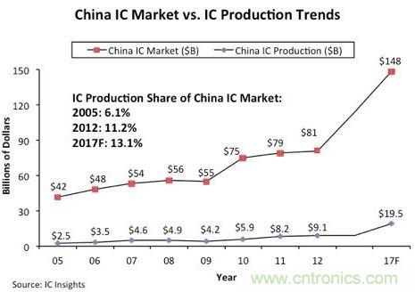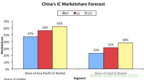 市場(chǎng)研究機(jī)構(gòu)IC Insights的最新預(yù)測(cè)報(bào)告指出,中國(guó)IC市場(chǎng)可望在2012~2017年之間,以13%的復(fù)合年平均成長(zhǎng)率(CARG)持續(xù)擴(kuò)張,報(bào)告同時(shí)指出,中國(guó)IC市場(chǎng)持續(xù)擴(kuò)張的背后,主要依靠來(lái)自外國(guó)制造商在中國(guó)地區(qū)的大規(guī)模投資建廠。