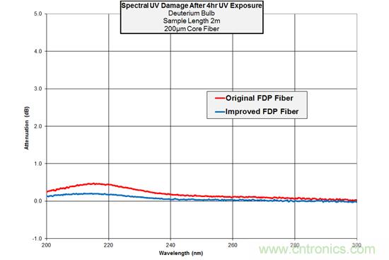 對于深紫外線領(lǐng)域應(yīng)用,高水平紫外線輻射的影響會(huì)引起光纖傳輸退化,光纖傳輸通常在數(shù)小時(shí)后發(fā)生損耗。