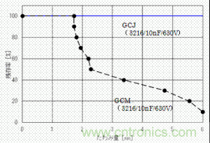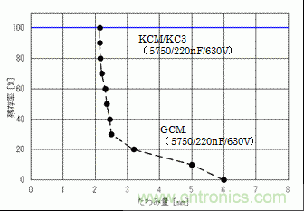 根據這個評價結果,于一般用2端子的MLCC(GCM系列)的殘存率的比較如圖7、圖8所示。GCJ、KCM/KC3系列,電路板的偏轉量在6mm的時候也看不見對陶瓷部分的破壞,于GCM系列相比耐電路板彎曲性有了飛速的改善。